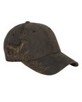 100% cotton, brushed chino twill; Camo - 60% cotton/40% polyester; Waxy - polyester/cotton/polyurethane blend; Blaze - 100% Polyester; Structured front; Pre-curved visor; Hook and loop backstrap; Detailed embroidered wildlife scene on right side; DRI DUCK embossed leather patch left of back vent; RealTree Max 4 is a mesh back cap;